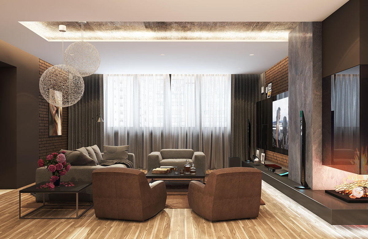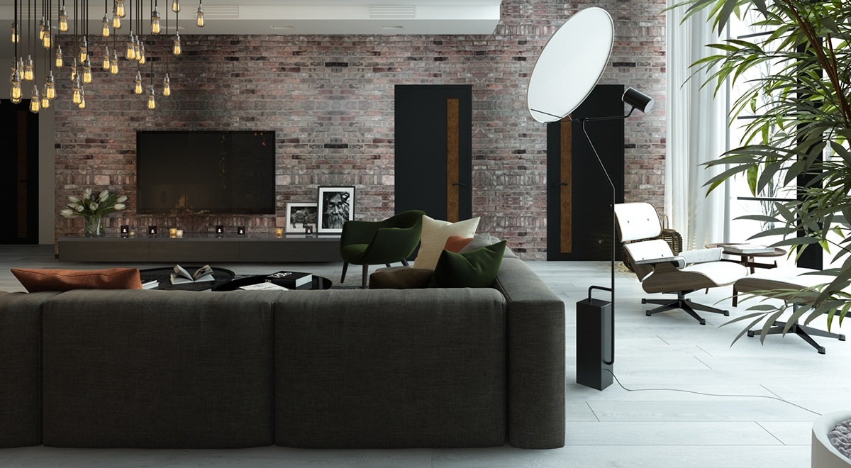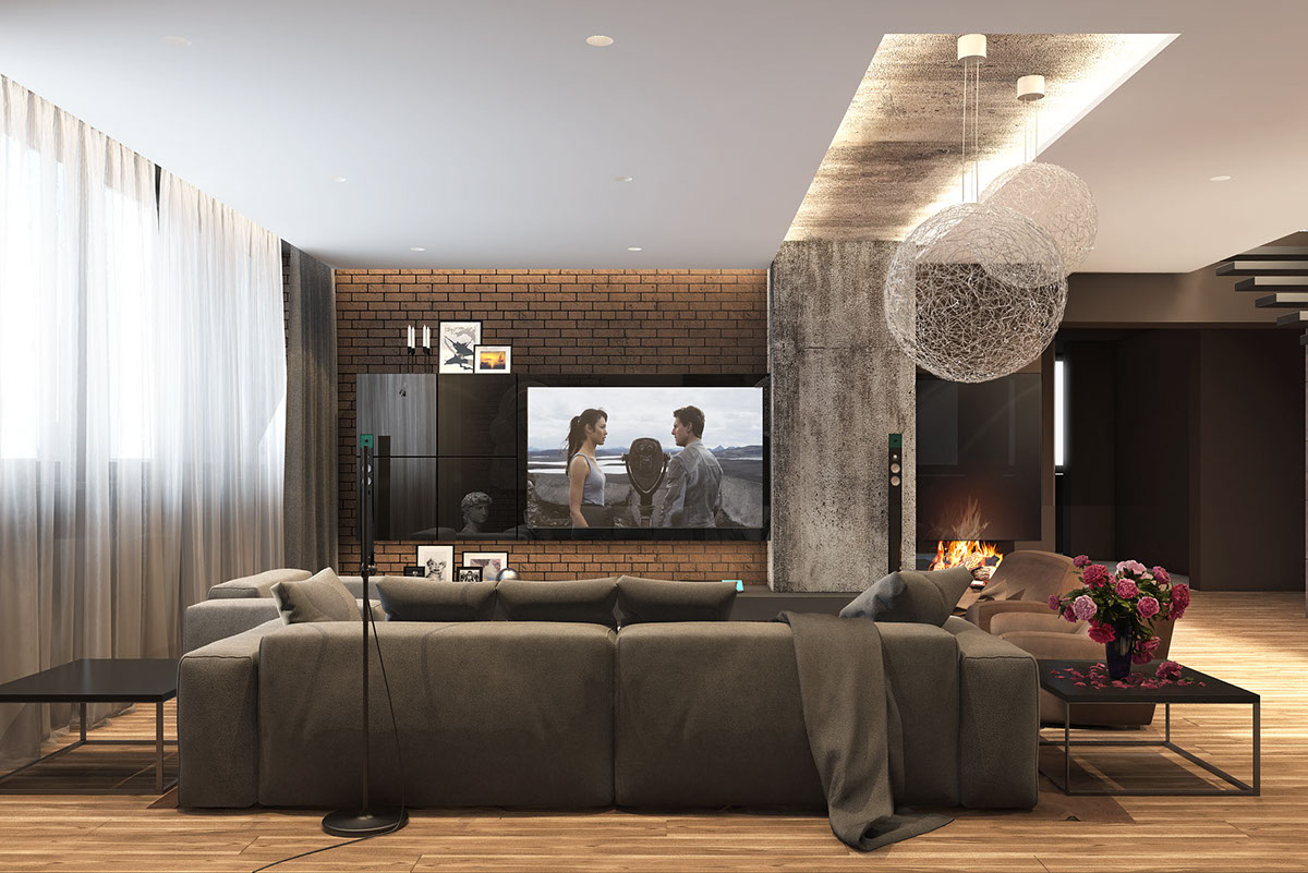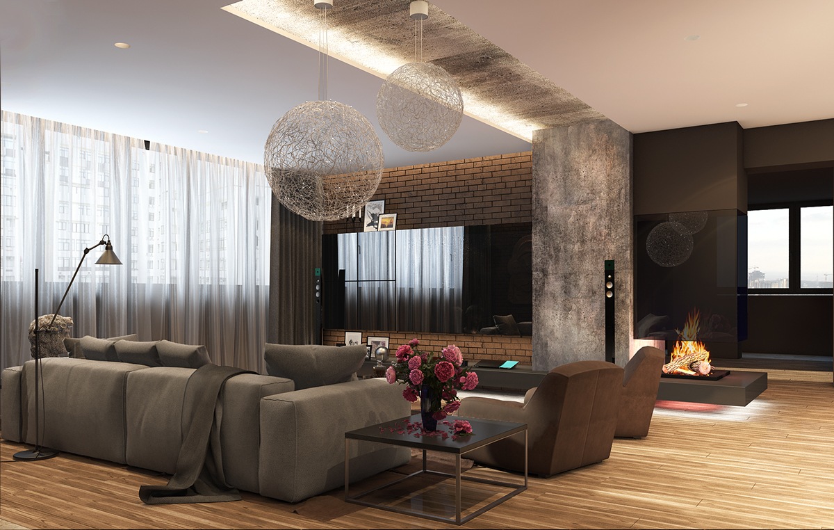 Dvoboj dnevnih boravakaPrvi primjer uredio je Sergey Procopchuk. Uz trosjed postavljen da gleda direktno prema TV-u, dizajner je postavio tri fotelje i tri stolića. Iznad sjedećeg dijela boravka vise velike lampe iz kolekcje Random Light koje je dizajnirao Bertjan Pot za Moooi. Goli betonski dio zida i stropa, te zid od opeke stvaraju urbano ozračje dnevnog boravka, dok mu kamin sa desne strane daje nezamjenjivu toplinu.