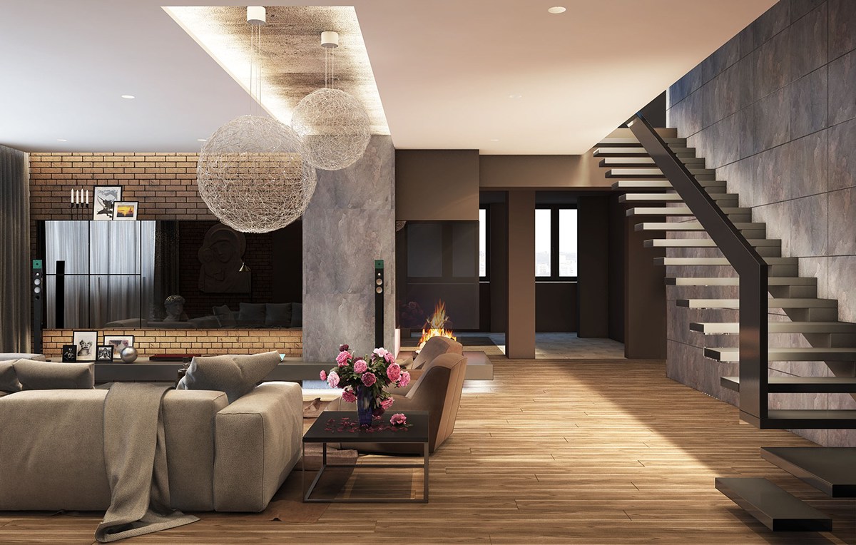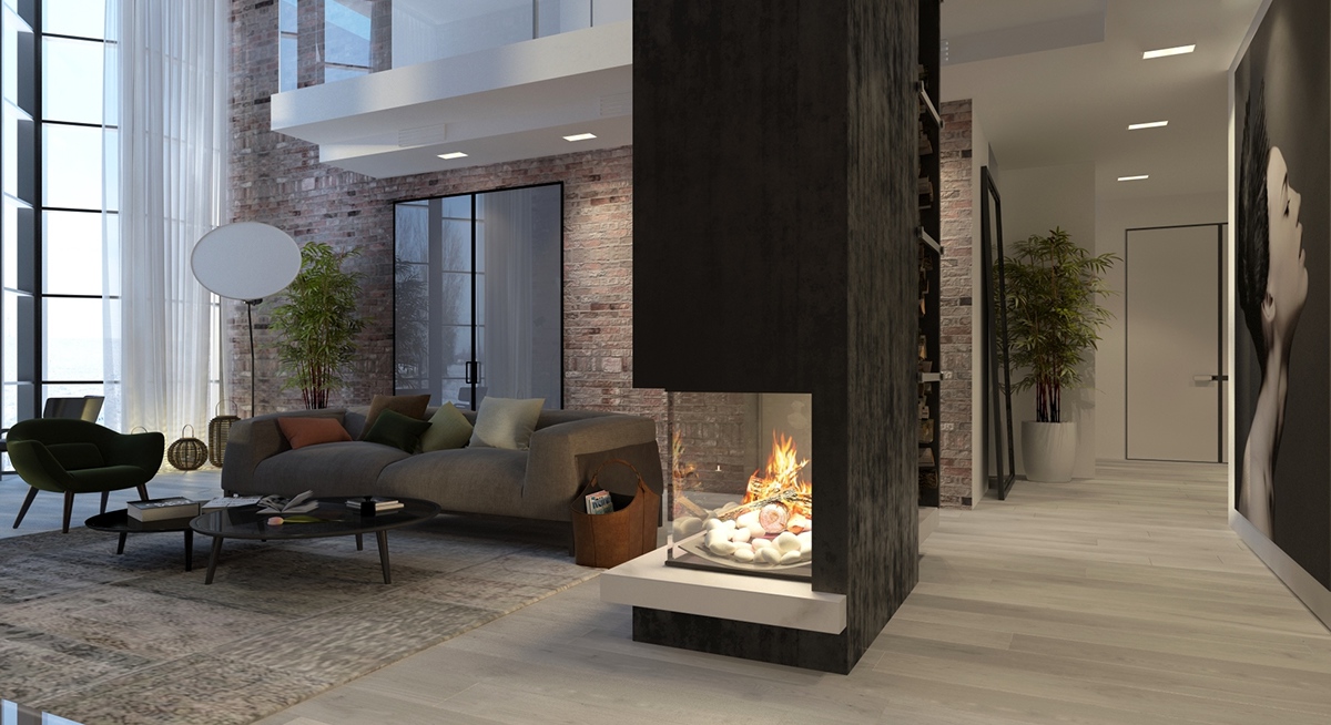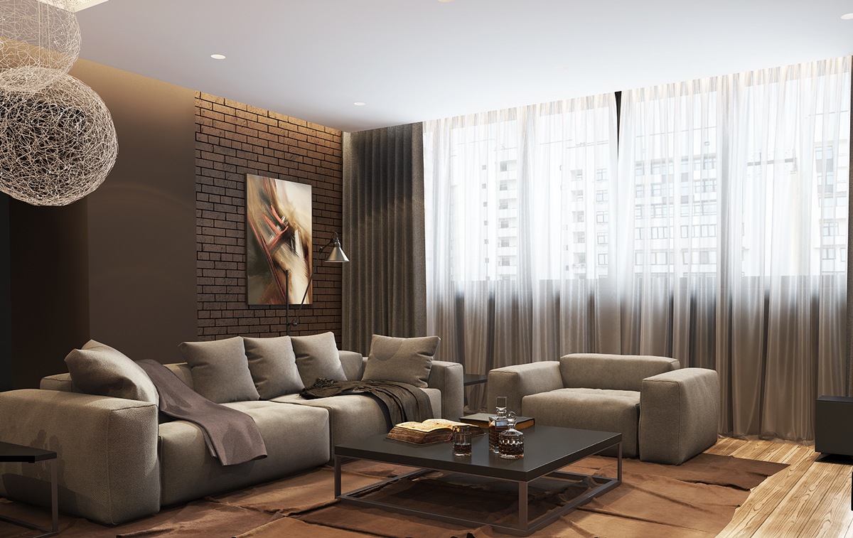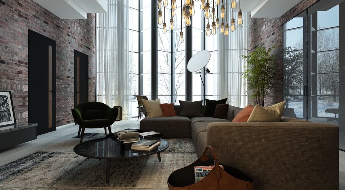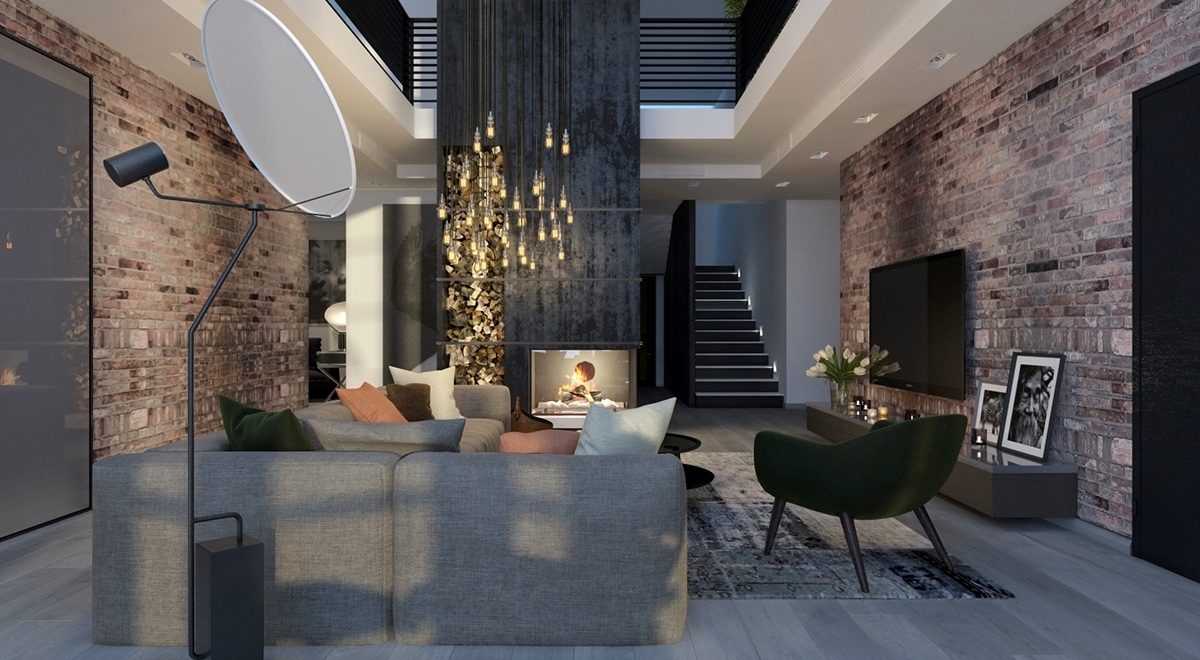Dvoboj dnevnih boravakaPrvi primjer uredio je Sergey Procopchuk. Uz trosjed postavljen da gleda direktno prema TV-u, dizajner je postavio tri fotelje i tri stolića. Iznad sjedećeg dijela boravka vise velike lampe iz kolekcje Random Light koje je dizajnirao Bertjan Pot za Moooi. Goli betonski dio zida i stropa, te zid od opeke stvaraju urbano ozračje dnevnog boravka, dok mu kamin sa desne strane daje nezamjenjivu toplinu.