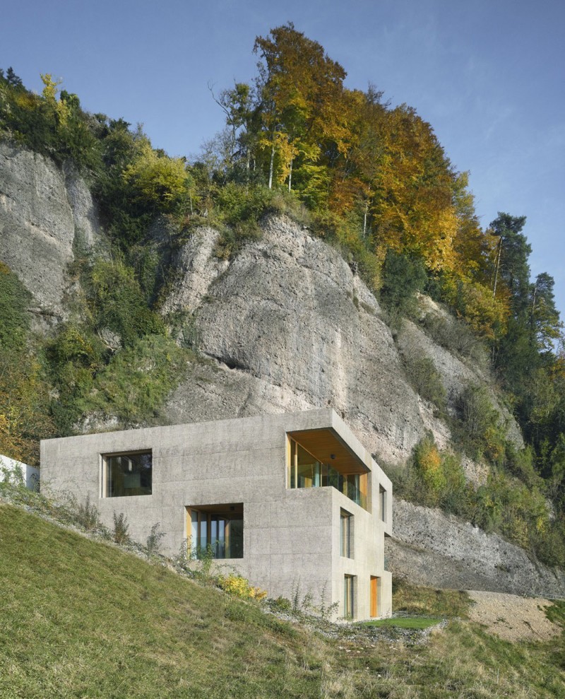 Kuća je smještena u mjestu Vitznau u Švicarskoj, a projektirana je u arhitektonskom studiu Lischer Partner Architekten Planer. Investitor je želio drvenu kuću, ali zbog okoliša u kojem se nalazi i vremenskih nepogoda kuća je dobila čvrsti betonski štit koji čuva mekanu drvenu jezgru kuće. Najprije je podignut montažni drveni okvir na koji su zatim postavljene betonske ploče.