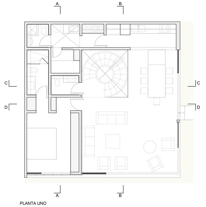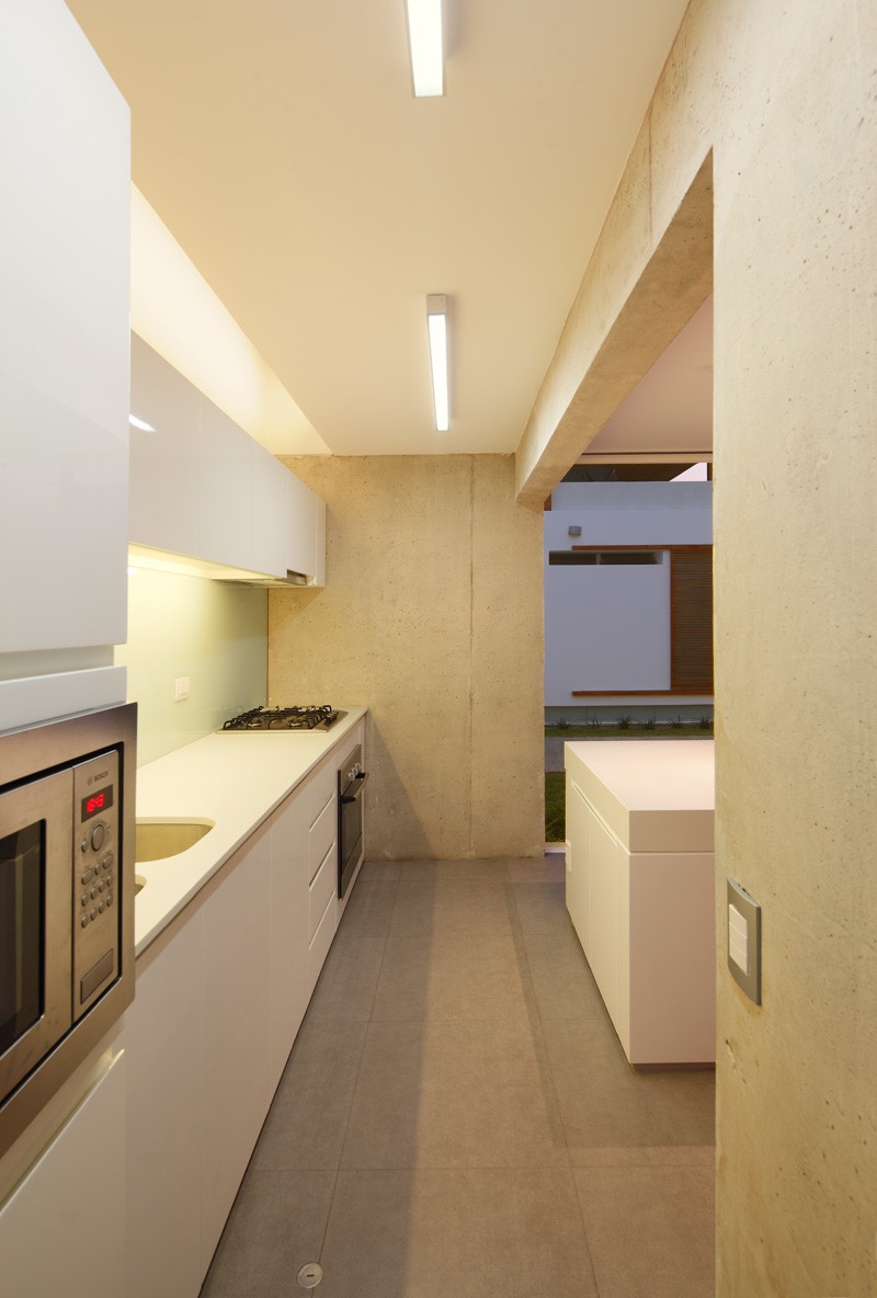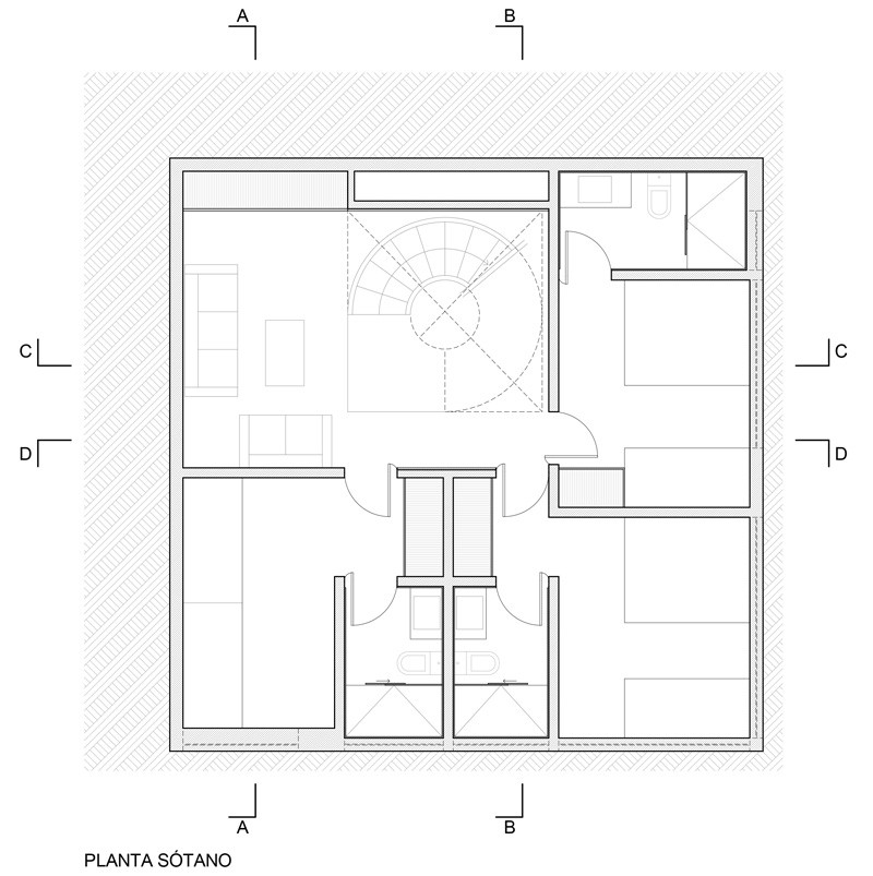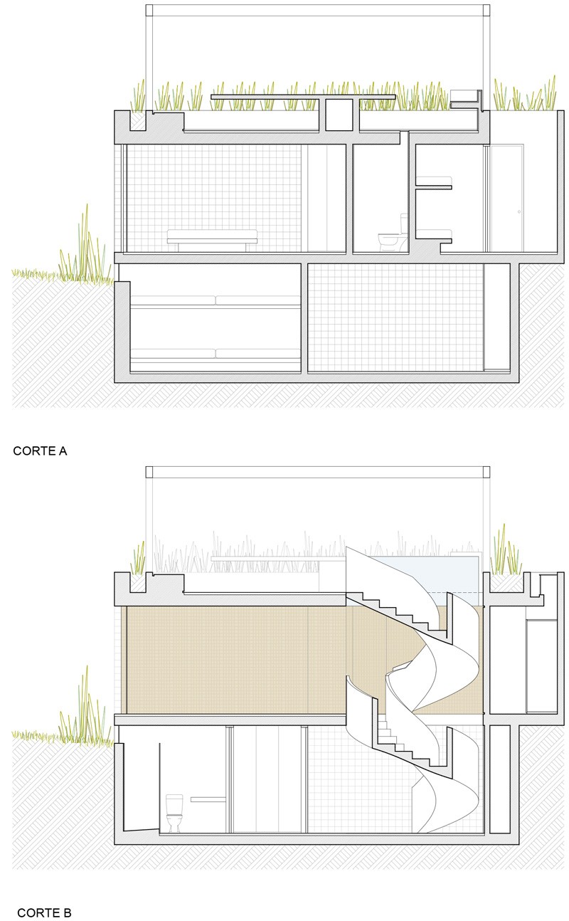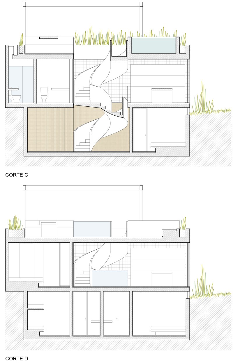 Kuća je podijeljena na tri glavna dijela: podrum, prizemlje i terasa. Prizemlje je malo podignuto iznad terena kako bi se stvorio prostor za uske i dugačke prozore kroz koje dnevna svjetlost dopire do podruma. Stakla tih prozora su matirana kako bi se sačuvala intimnost u tim prostorijama.