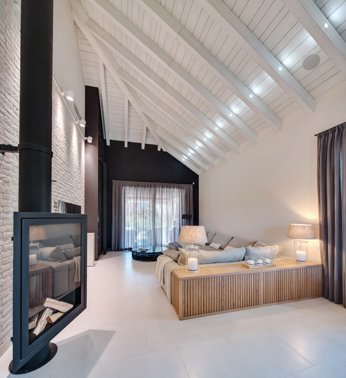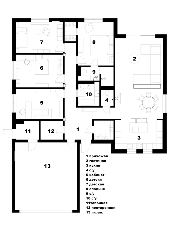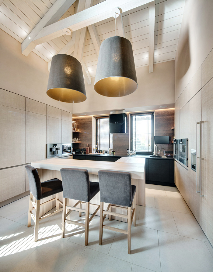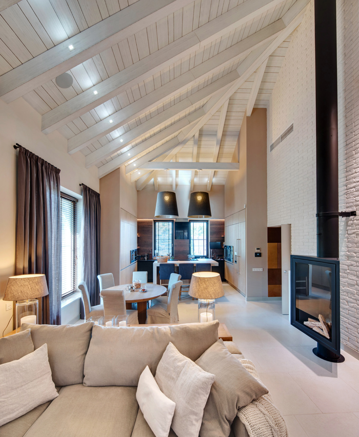 Unutar zidova postojeće kuće arhitekti studia FORM iz Kijeva uredili su moderan dom i u potpunosti udovoljili željama investitora. Kuća se može etiketirati kao prizemnica obzirom da se sve prostorije nalaze u prizemlju, osim prostrane garderobe koja se nalazi u potkrovlju. Površina kuće je 270 m² i sadrži kuhinju, blagovaonicu, dnevni boravak, 3 spavaće sobe od kojih jedna ima privatnu kupaonicu, dodatnu kupaonicu i wc, radnu sobu, spremišta, garažu i garderobu u potkrovlju.