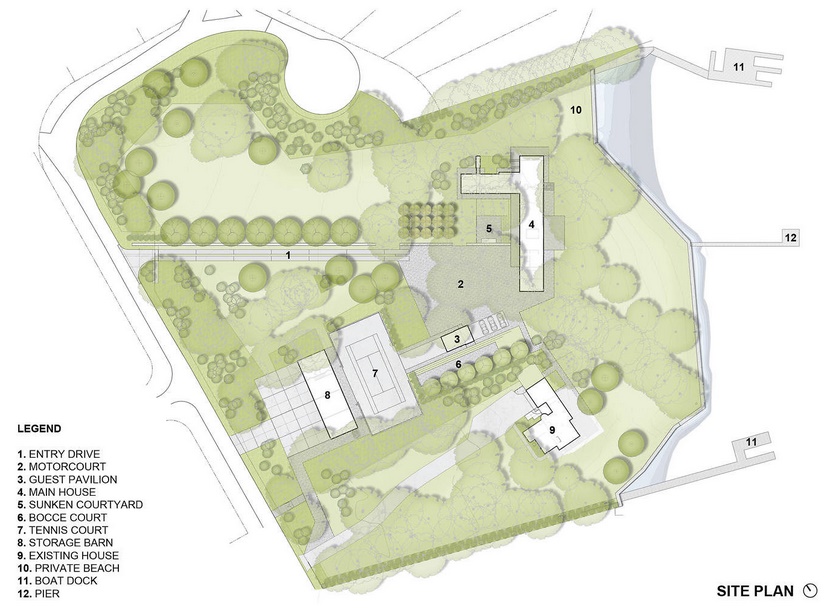 Cilj projekta bio je izgraditi rezidenciju prepoznatljivog izgleda poput umjetničkog djela, uklopljenu u prirodno okruženje, a koja će zahtjevati minimalno održavanje. Velika površina parcele omogućila je da se objekti pažljivo pletu kroz gustu šumu borova koje je vlasnik posadio kao dijete. Tlocrt u obliku slova L  iskorišten je za stvaranje stražnjeg dvorišta koje će pružiti zaštitu od vjetrova. Jednostavna paleta materijala beton, čelik, tikovina i staklo upotrijebljena je za izgradnju objekta i njegovu vanjsku vizuru. Cjelokupni projekt imao je jasne smjernice s izuzetkom kuće na drvetu koja je dizajnirana kao mjesto za dječju igru. Velike površine kliznih staklenih stijena omogućuju snažnu povezanost s otvorenim prostorom i pejzažnim elementima kao što su spušteno dvorište sa ognjištem i spušteni teren za bočanje kako bi postali sastavni dio arhitekture.