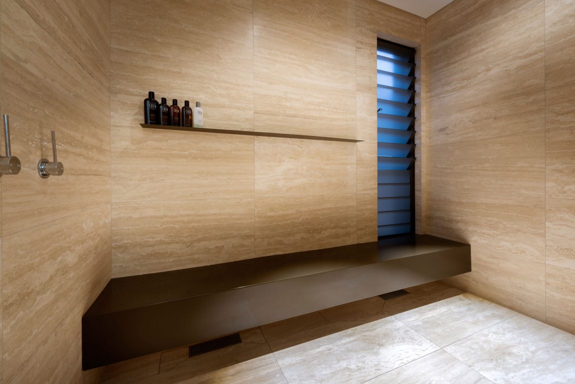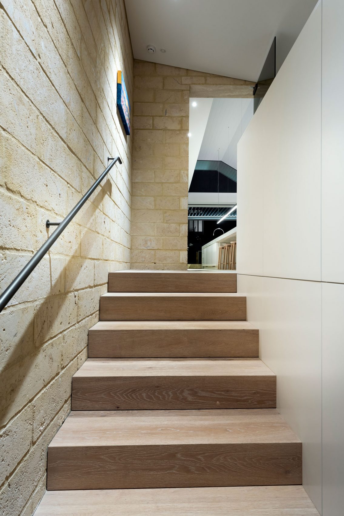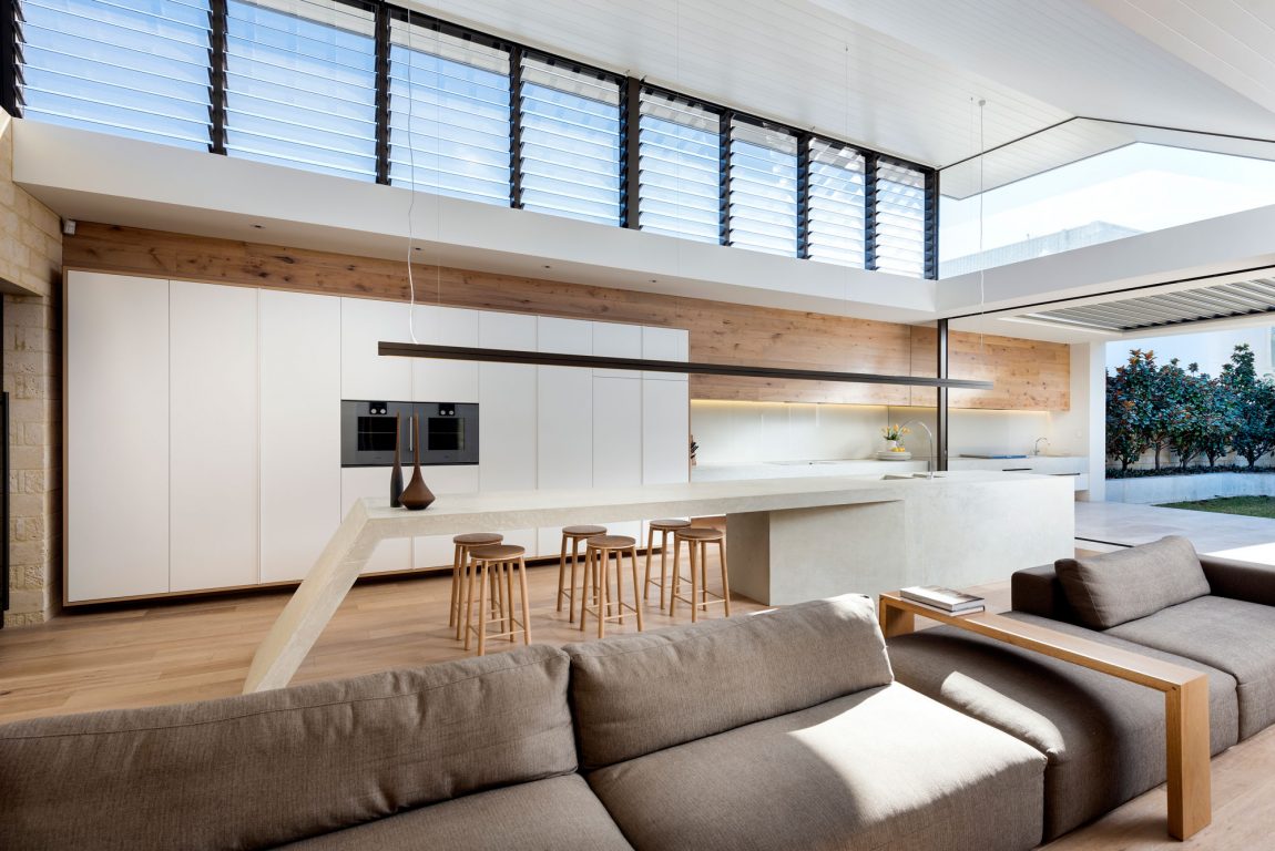 Zidovi u društvenom dijelu nemaju klasičnih prozora. Zid prema terasi pretvoren je u staklenu stijenu, dok ostatak svjetlosti dopire kroz ostakljenje smješteno ispod samog krova. Na taj način zidovi su maksimalno iskorišteni za postavljanje namještaja i dekoracija, a prostor je ispunjen dnevnim svjetlom.