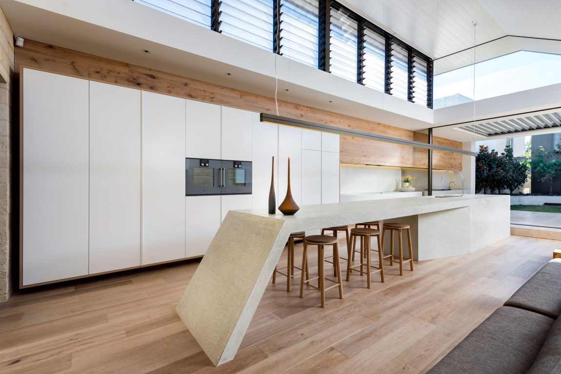 Kuhinjski otok proteže se gotovo cijelom dužinom prostora i ujedinjuje kuhinju i blagovaonu u nastavku.