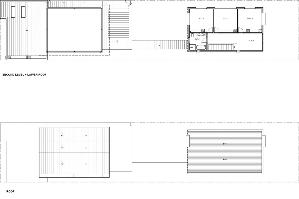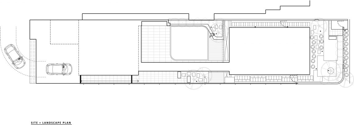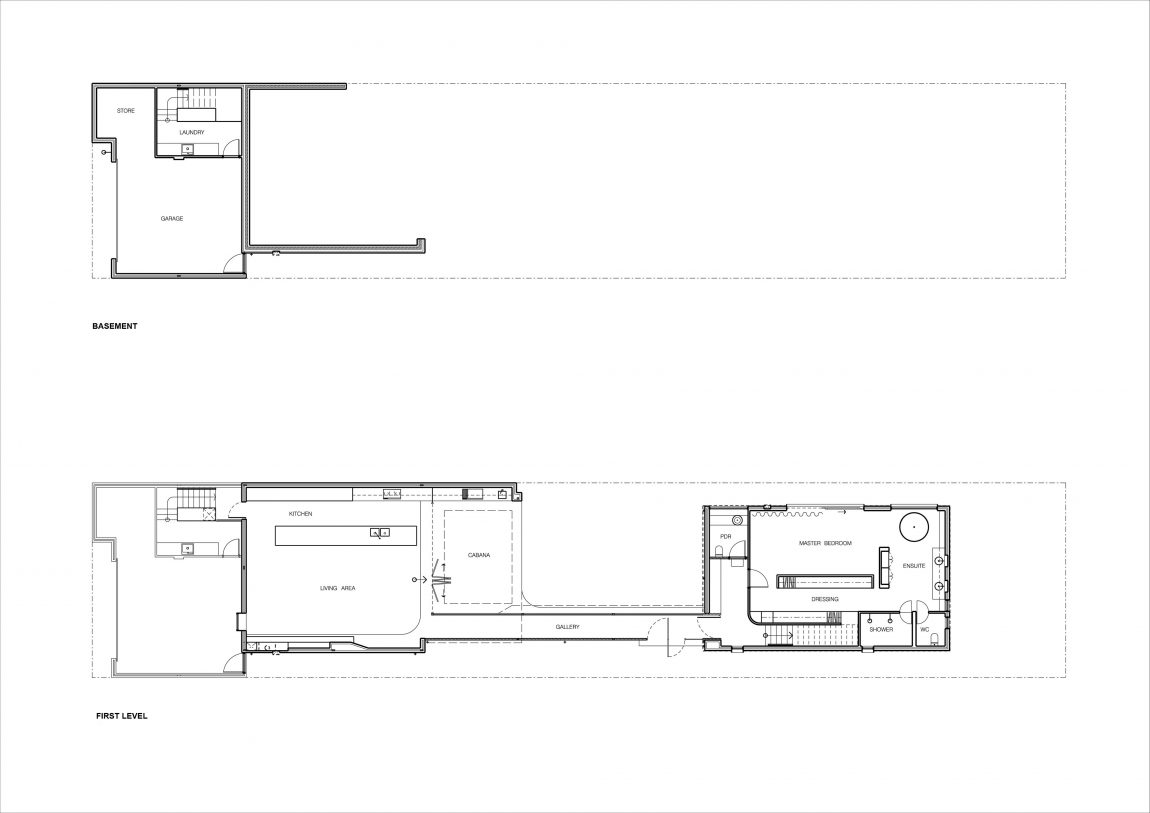 Druga polovica kuće ima društvenu ulogu. Sastoji se od podruma i prizemlja. Obzirom na kosinu terena koja se proteže duž parcele, arhitekti su iskoristili tu činjenicu i napravili podrum odnosno garažu sa spremištem te vešerajem u nastavku. Stubište iz podruma vodi u središte društvenog dijela, gdje otvoreni prostor objedinjuje dnevni boravak, kuhinju i blagovaonu. Taj kompletni prostor povezan je sa terasom i centralnim dvorištem, a sama kuhinja ne poznaje granice i kroz staklenu stijenu nastavlja svoj put na terasu.