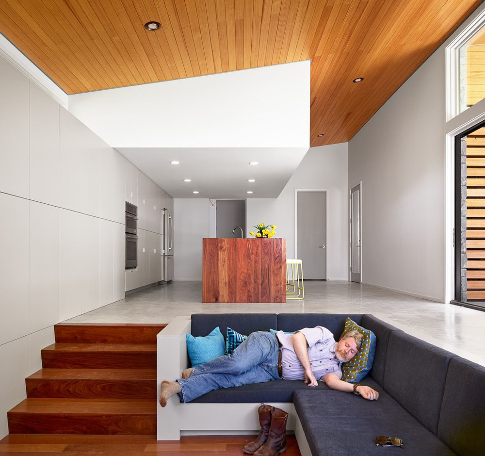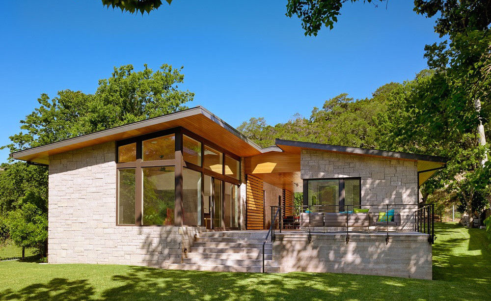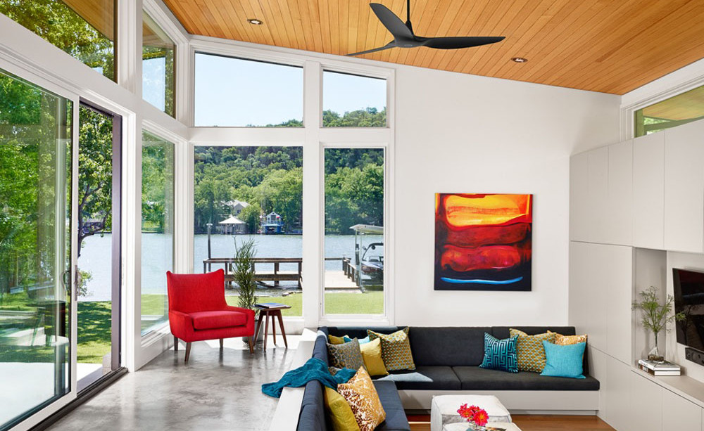 Kvalitetan i opušten način života teško je postići u malom gradskom stanu, ali zato ovakva mala prizemnica uz jezero omogućuje mnogo toga što je u gradskom stanu nemoguće. Prirodni materijali i staklene površine stvaraju dojam kao da je kuća dio prirode koja je okružuje. Tome dodatno dopridonosi blagavaona u središnjem dijelu objekta, koja otvaranjem kompletne stijene postaje poluotvoreni dio kuće sa pogledom na jezero. Glavni dio dnevnog boravka spušten je nekoliko stepenica niže u odnosu na ostatak kuće, dok je sjedeća garnitura izrađena kao njegov fiksni dio. Kuću je projektirao Stuart Sampley, a kako izgleda ostatak kuće pogledajte na fotografijama u nastavku.