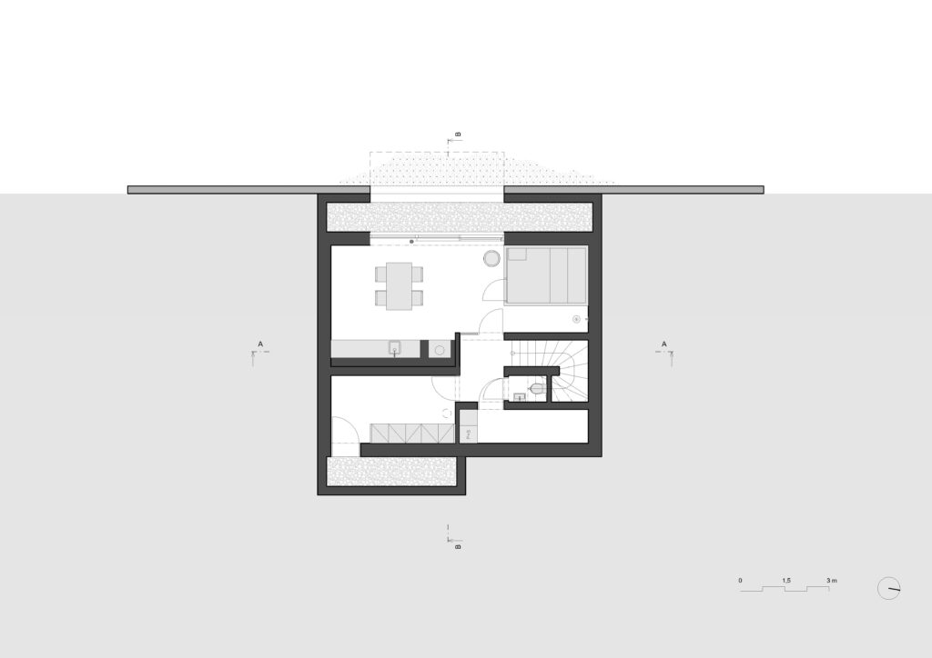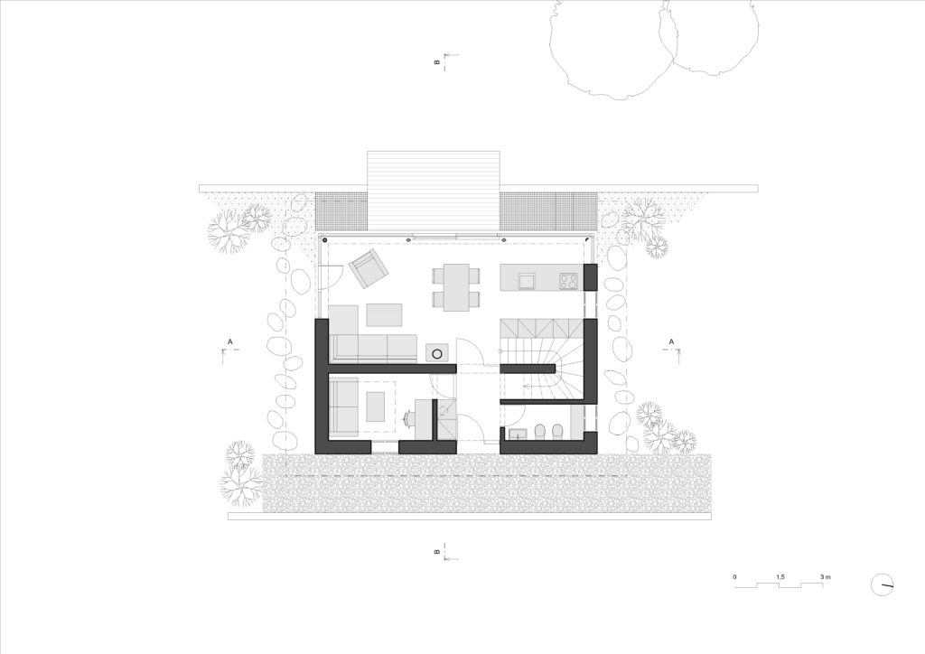 Ulazni prostor vodi izravno u dnevni boravak otvorenog tlocrta s panoramskim prozorima i izlazom na zapadnu terasu. U prizemlju se nalazi i ured, kupaonica te WC.