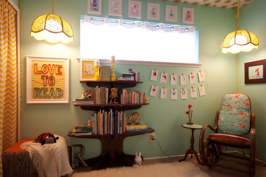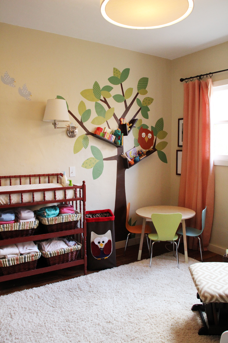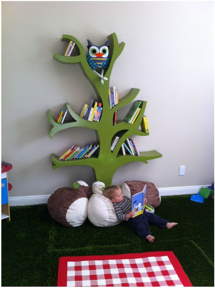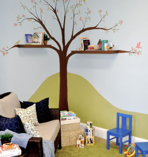 Šarena kombinacija zidnih naljepnica i polica savršena je za dječje sobe. Možete se poigrati bojama ili umjesto naljepnica naslikati drvo na zidu.