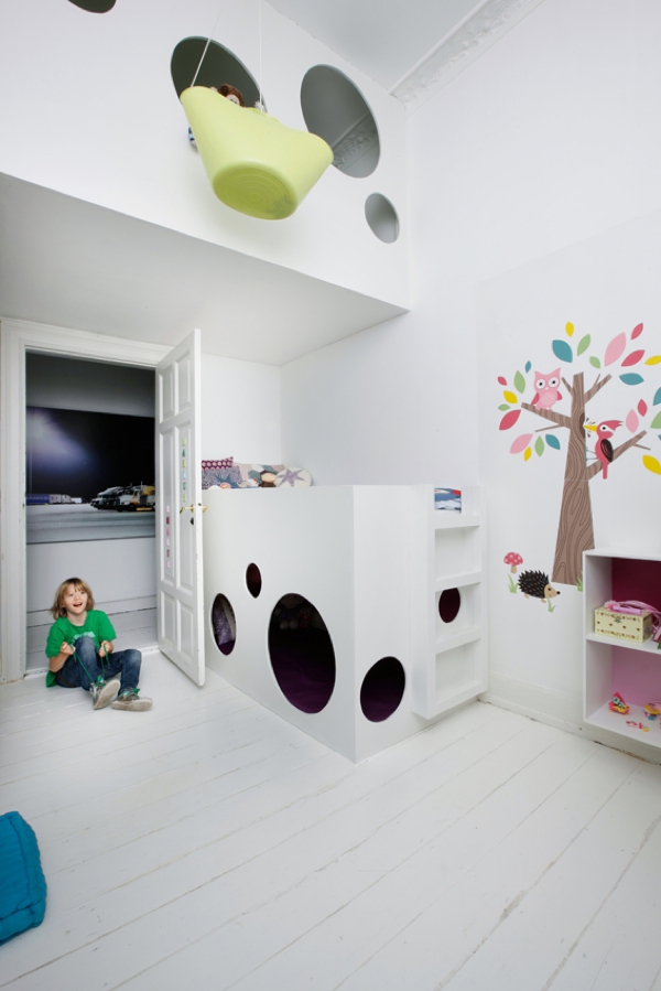 Djeca kao i odrasli voljela bi u stanu imati svoj kutak za igru i učenje. Soba koju vam predstavljamo upravo im to omogućuje. Zanimljiv dizajn ove dječje sobe potiče djecu na igru, kreativnost i učenje. Otvoreni ormar odjeljen je od ostatka sobe ljestvama koje vode do kreveta na višem nivou. Drugi krevet je također podignut od poda kako bi se djeci omogućio što veći prostor za igru. Prostor ispod kreveta je zatvoren, a na pregradi kao i na gornjem nivou su izbušeni kružni otvori koji pozivaju djecu na igru. Prostor je obojen bijelom bojom kako bi se malom prostoru dalo što više svjetlosti. Da ne bi sve bilo u bjeloj boji pobrinuli su se šareni detalji: zavjesa, veselo drvo na zidu i plavi radni stol i stolice. Za ovakvu sobu nije potrebna neka velika investicija, a djeca će sigurno biti oduševljena.