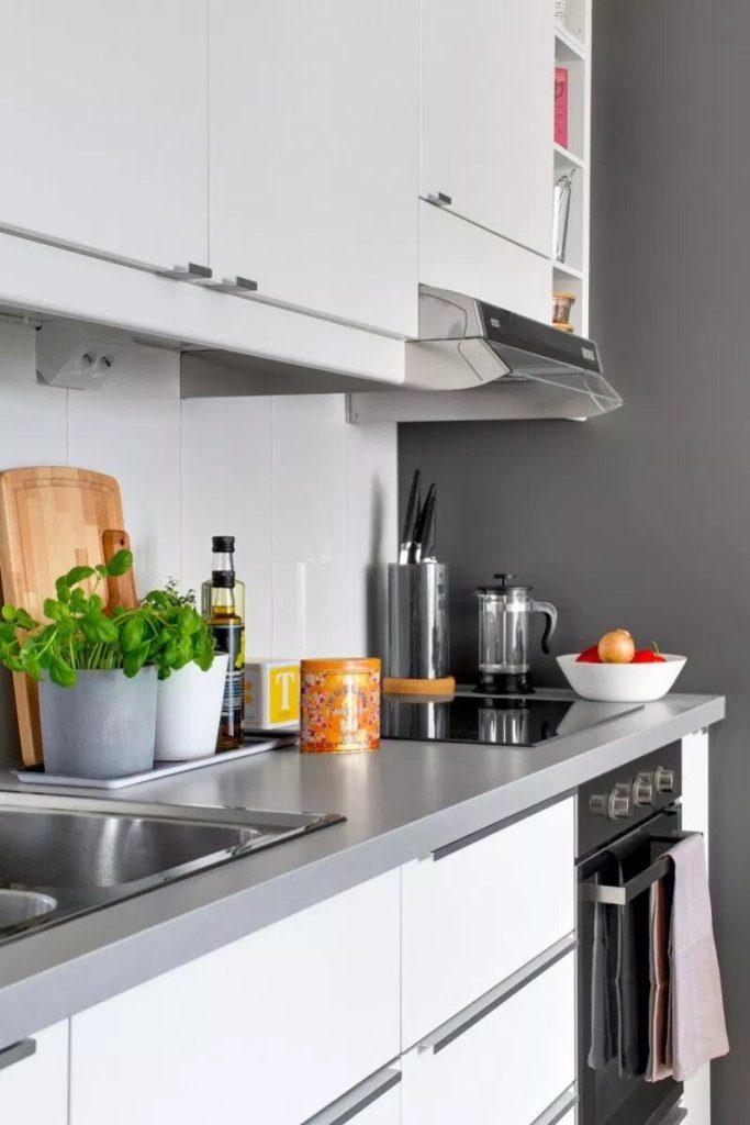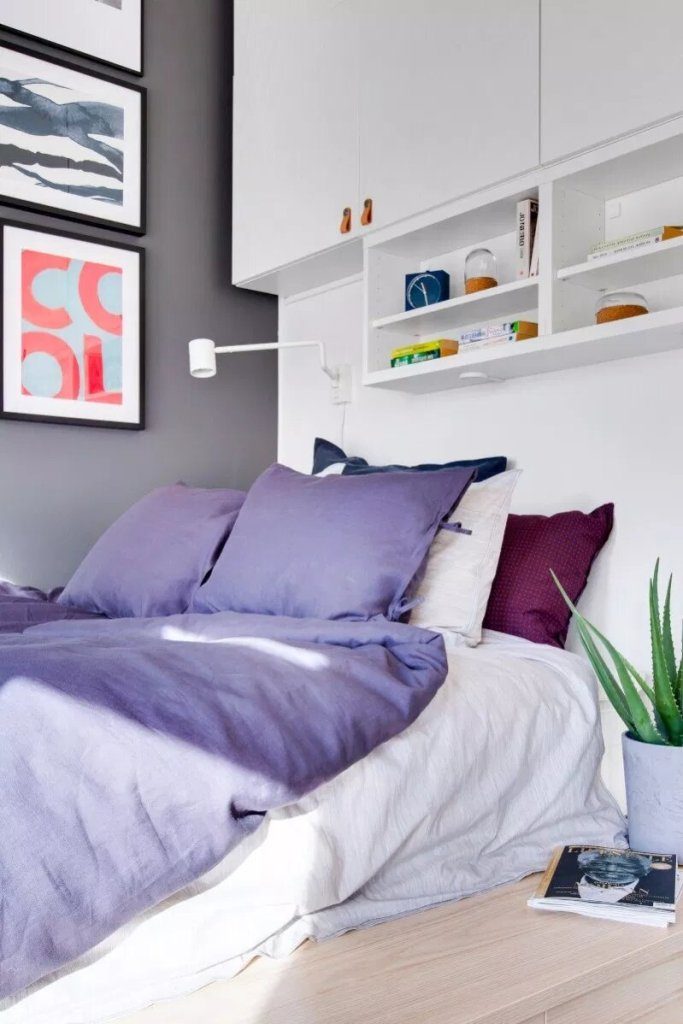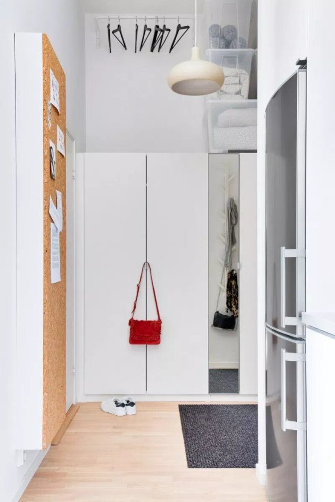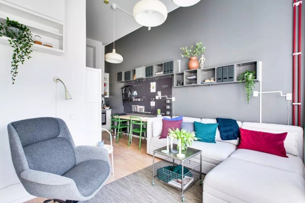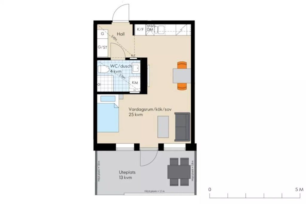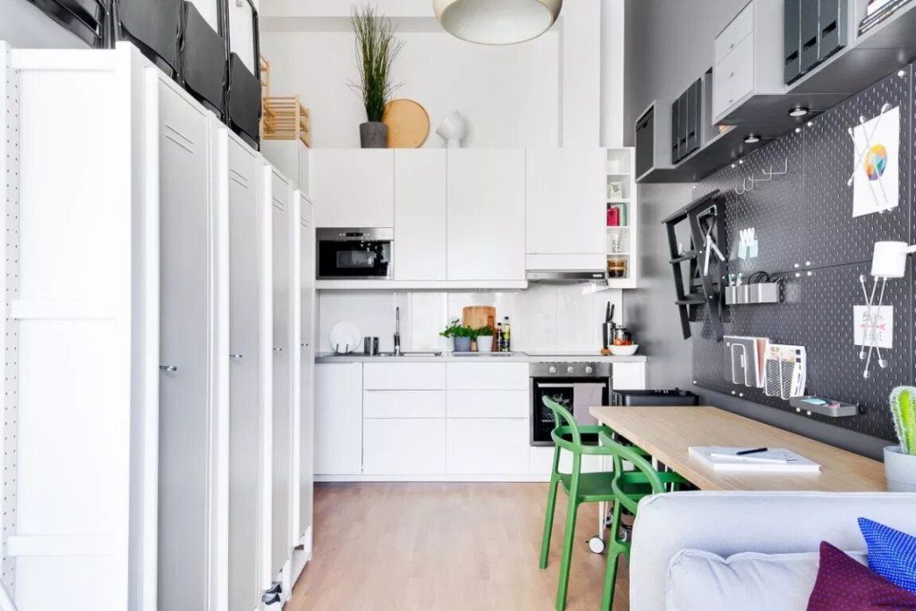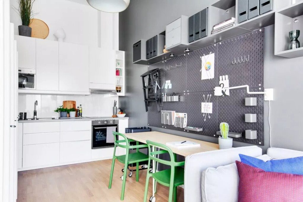 Ova garsonjara uređena je po mjeri studenata ili samaca koji dio svojeg posla obavljaju kod kuće. Iznad radnog stola koji je ujedno i kuhinjski nalazi se perforirana ploča čiji raster perforacija omogućuje višenamjensko korištenje i prilagođavanje prema trenutnim potrebama. Stan ima površinu od 34 kvadrata u kojem su prostori raspoređeni polukružno u odnosu na kupaonicu. Od ulaza sa garderobom preko kuhinje i blagovaone/radnog prostora do dnevnog boravka i spavaće sobe iz kojih se izlazi na terasu.
