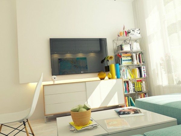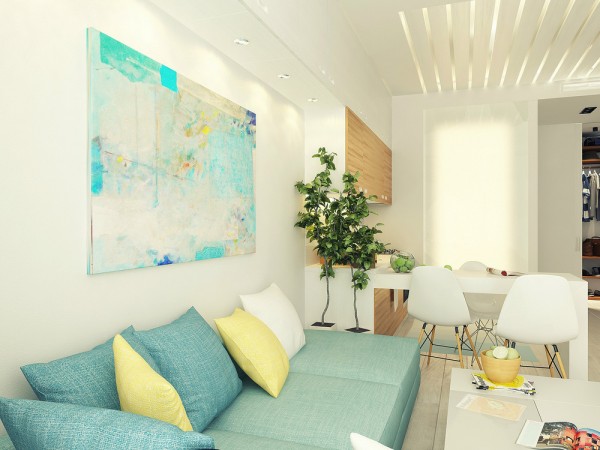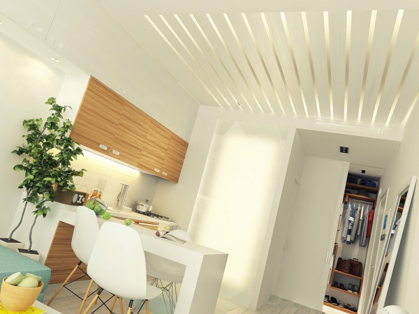 Bijeli ormarići na zidu protežu se duž cijelog stana, od kuhinje do dnevnog boravka i čine dragocjeni prostor za spremanje stvari. Isti ormarići iskorišteni su za postavljanje prigušenog osvjetljenja koje stvara poseban ugođaj u stanu.