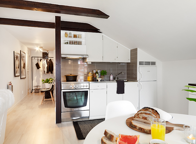 Imate mali prostor u potkrovlju koji želite preurediti u stan, ali neznate kako jer smatrate da nećete imati dovoljno prostora? Ako je vaš odgovor da, možda vas stan koji predstavljamo u ovoj galeriji inspirira da dođete do idejnog rješenja. Nasuprot ulaznih vrata u ovaj stan površine 34m² nalazi se “walk in” ormar/garderoba. Kratkim hodnikom dolazi se do otvorenog dnevnog boravka sa blagavaonom i kuhinjom. Iza zida kuhinje smještena je kupaonica. Cijeli stan ima prozore samo na jednom zidu dnevnog boravka i zbog toga je spavaća soba spojena sa dnevnim boravkom kako bi se iskoristila prirodna svjetlost. Ugradnjom krovnog prozora mogli bi još spavaću sobu odjeliti od dnevnog boravka zidom, ali niti ovako nije loše.