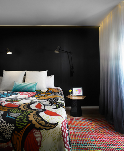 Dvije kupaonice najviše se razlikuju po boji, dok su zidovi jedne crni, druga je u potpunosti bijela. Spavaća soba kao i ostatak stana ima jedan zid crne boje te šareni tepih na podu i šareni pokrivač na krevetu. U ovom stanu zaista možete vidjeti mnogo neobičnih kombinacija.