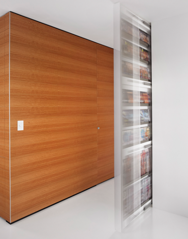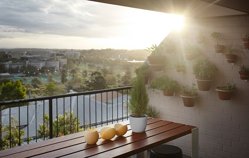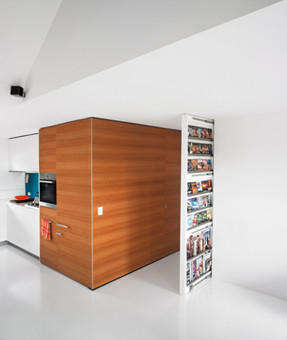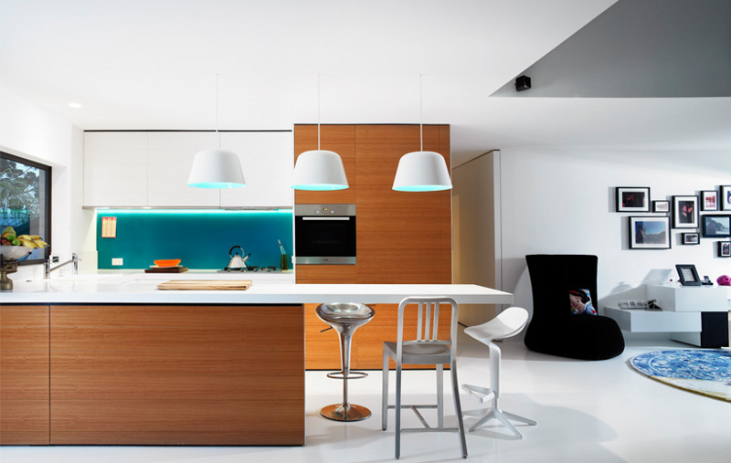 Dnevni boravak sastoji se iz dva dijela, prvi je orjentiran prema televizoru, dok manji dio iza njega služi za čitanje knjiga. U nastavku dnevnog boravka iza velikih prozora i staklenih vrata nalazi se balkon, dovoljno velik da se na njega smjesti stol i stolice. Kuhinja za razliku od ostatka stana nema crnih dijelova, već je izvedena u kombinaciji bijele boje i drvenih panela sa plavim zidom iza radne plohe. Tri velika bijela lustera koja se protežu iznad kuhinje i blagavaone obasjavaju prostor plavom bojom.