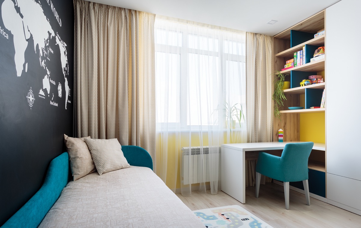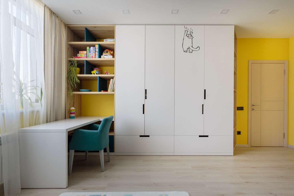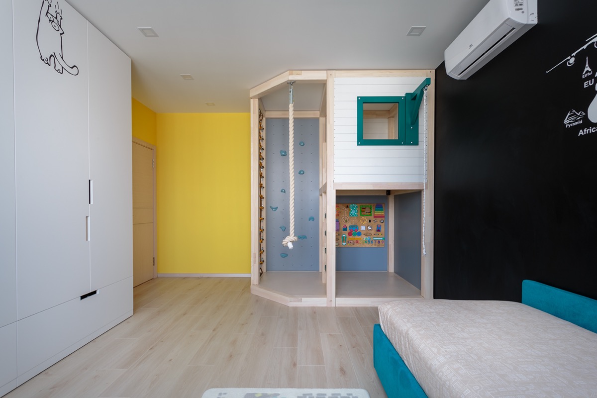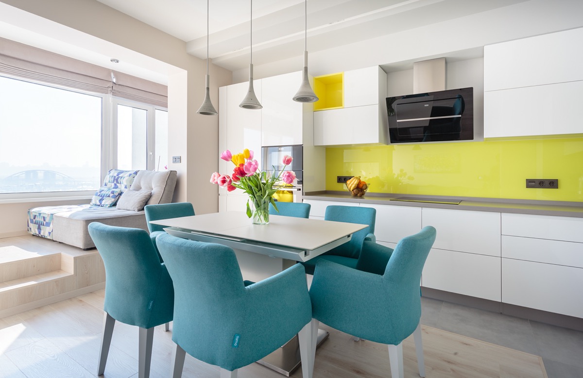 Ovaj skladan stambeni prostor vedrog i svjetlom ispunjenog ugođaja uredila je Olga Tarasenko. Stan se sastoji od otvorenog prostora koji objedinjuje kuhinju i veliki dnevni boravak, glavne i dječje spavaće sobe te dvije kupaonice. Prostor je isprepleten s tirkizno plavim detaljima i ponekim kontrastom žute boje koji pojačava pozitivan energetski utjecaj prostora. Zabavna shema savršena je za mladu obitelj, ona naglašava moderan stil uređenja prilagođen za odrasle, koji je ujedno i nadahnjujući te vizualno poticajan za mlađe članove obitelji. Čak i za tmurnih i kišnih dana, ova shema boja stvara dojam kao da sunce sja.
