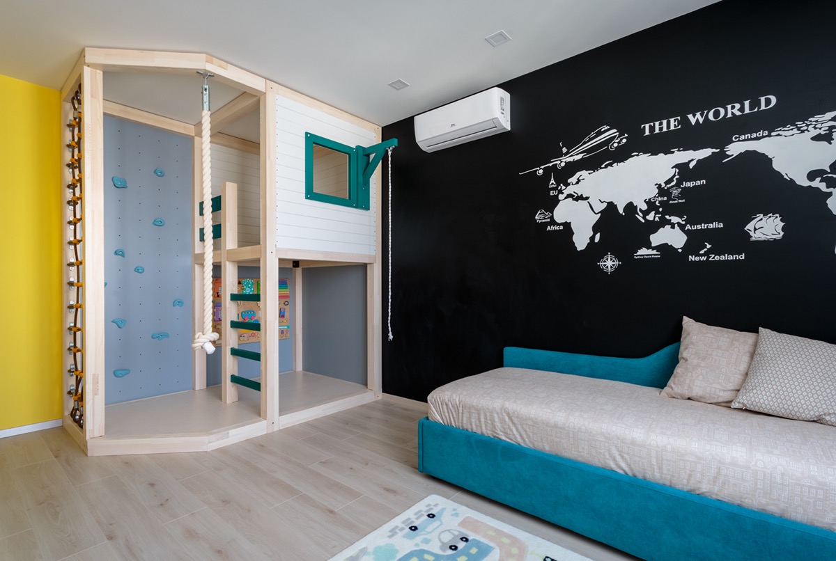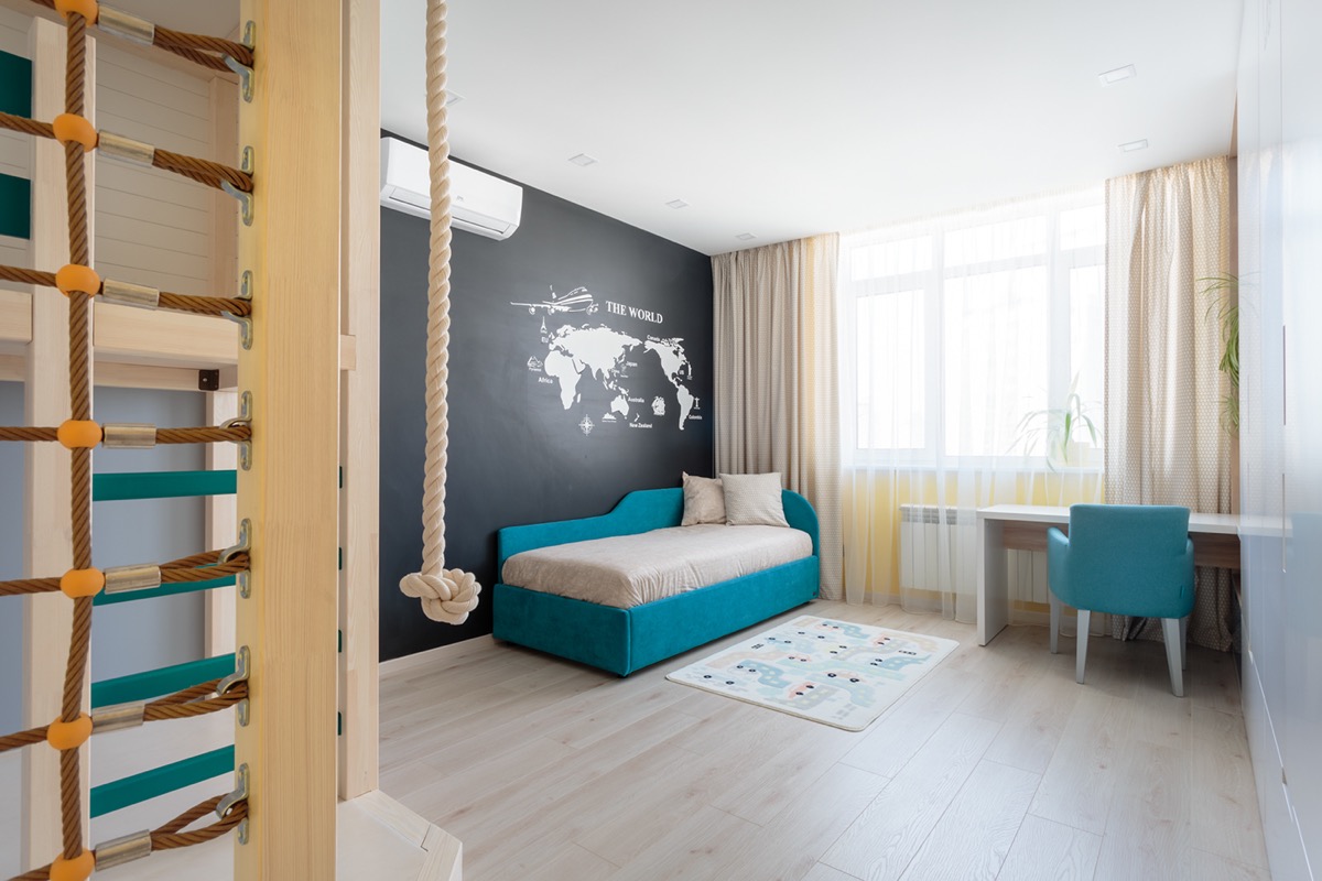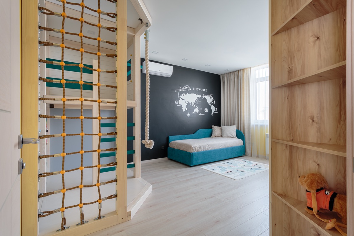Ovaj skladan stambeni prostor vedrog i svjetlom ispunjenog ugođaja uredila je Olga Tarasenko. Stan se sastoji od otvorenog prostora koji objedinjuje kuhinju i veliki dnevni boravak, glavne i dječje spavaće sobe te dvije kupaonice. Prostor je isprepleten s tirkizno plavim detaljima i ponekim kontrastom žute boje koji pojačava pozitivan energetski utjecaj prostora. Zabavna shema savršena je za mladu obitelj, ona naglašava moderan stil uređenja prilagođen za odrasle, koji je ujedno i nadahnjujući te vizualno poticajan za mlađe članove obitelji. Čak i za tmurnih i kišnih dana, ova shema boja stvara dojam kao da sunce sja.