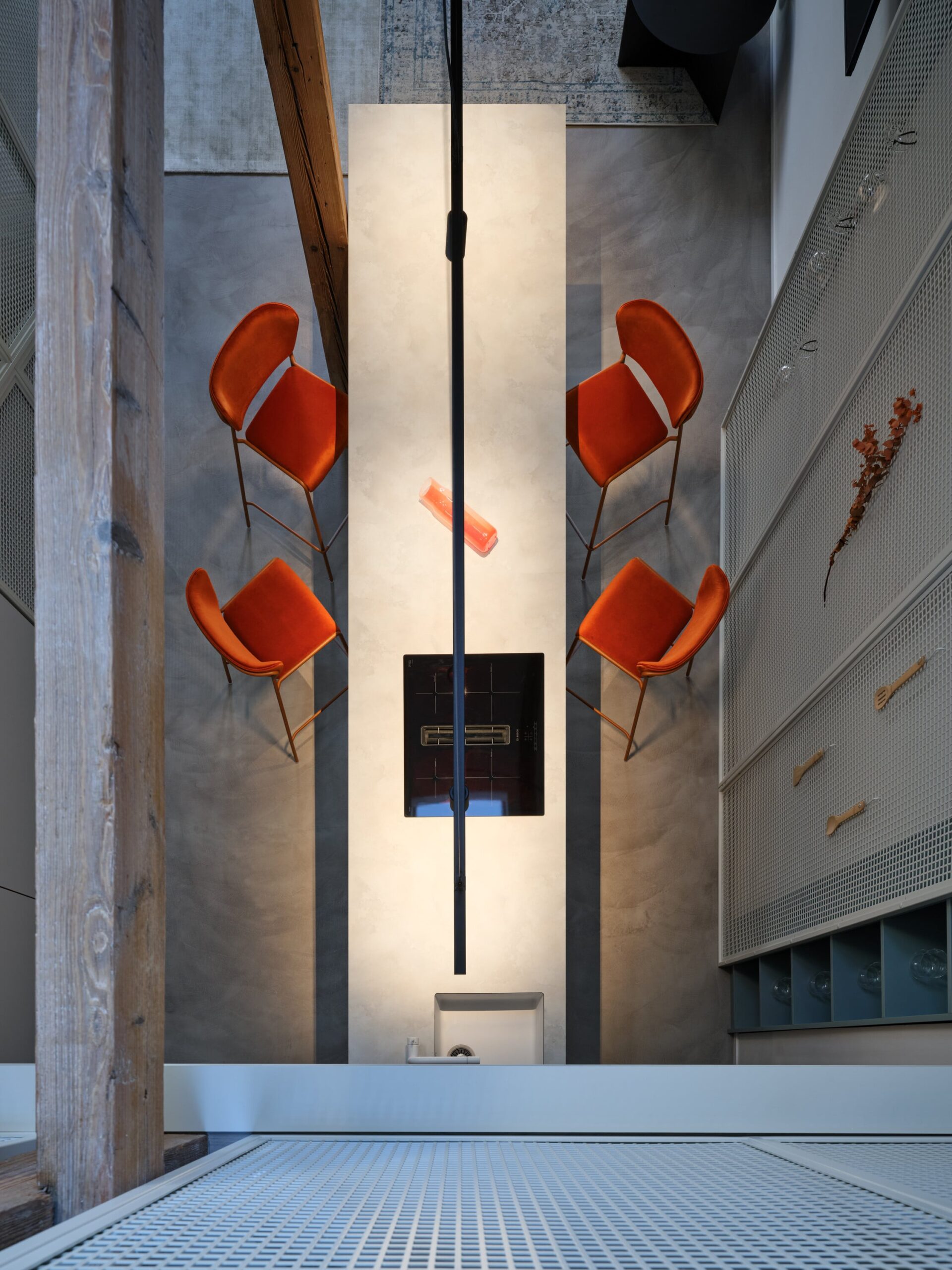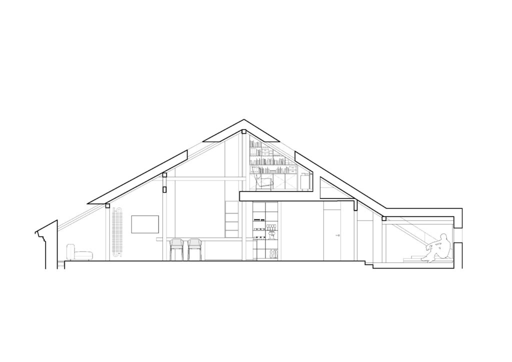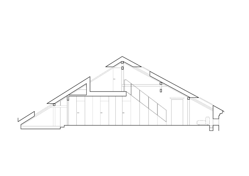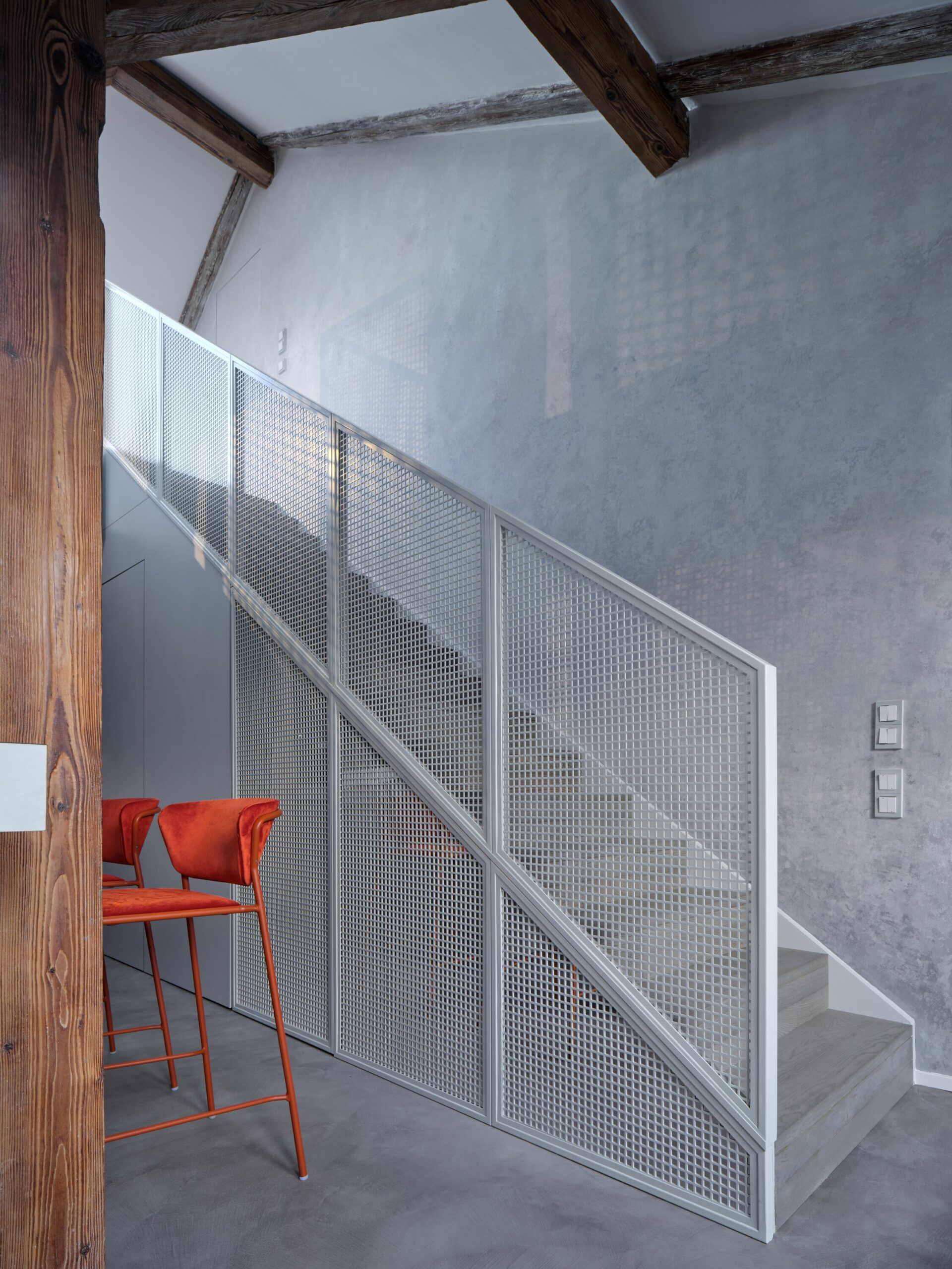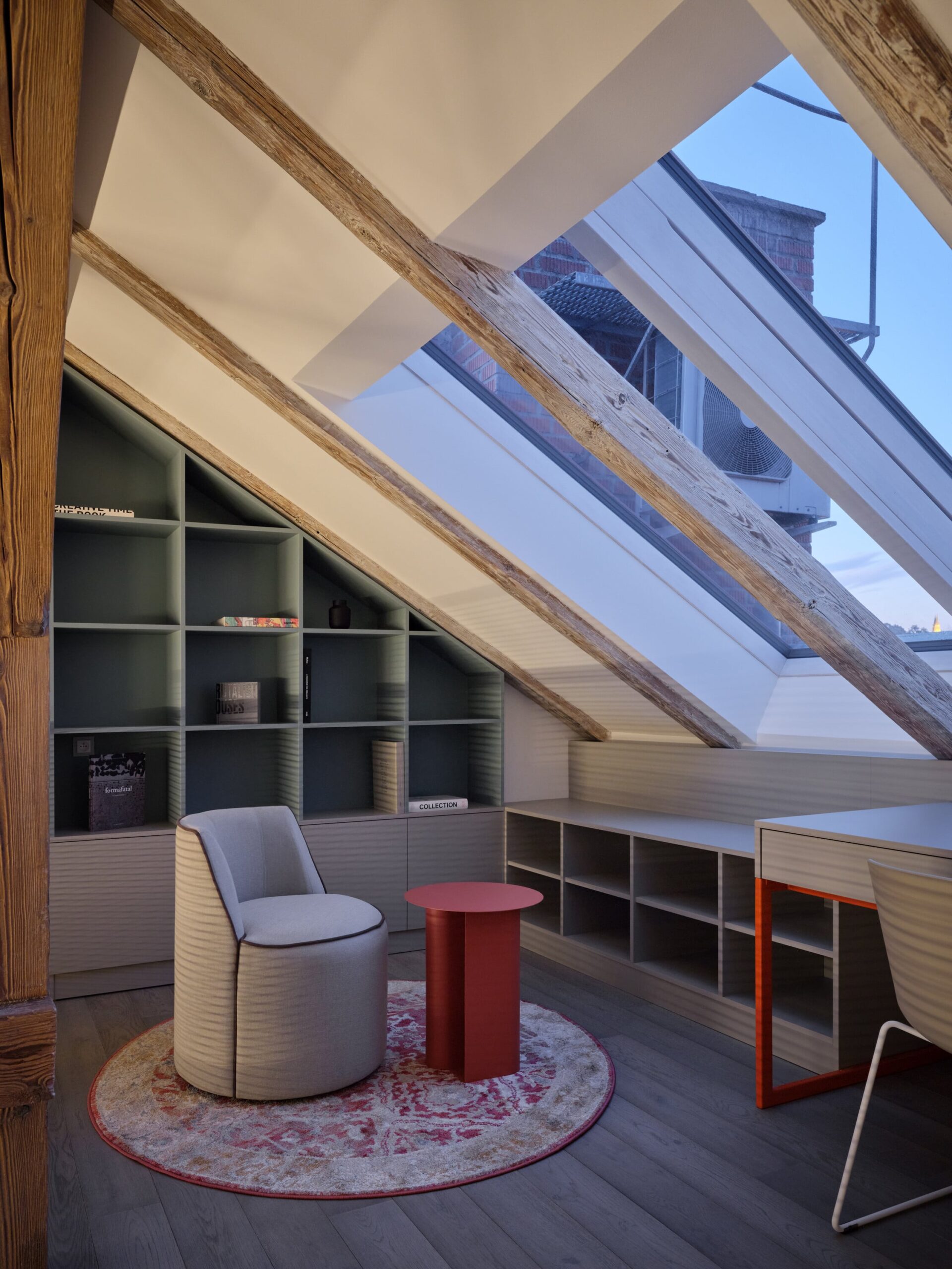 Veliki izazov za nas bila je složenost starog tavanskog prostora. Nastojali smo s njim postupiti osjetljivo uključujući unutarnje elemente koje smo dizajnirali i izradili po mjeri, kao što je uobičajeno za nas. Rezultat je harmoničan kontrast između modernih umetnutih elemenata i stare priče koju pričaju grede originalne krovne konstrukcije. Taj dijalog između povijesnog i modernog daje prostoru jedinstveni karakter i stvara privlačan ambijent za njegove stanare.