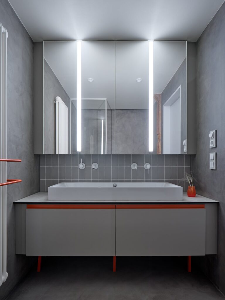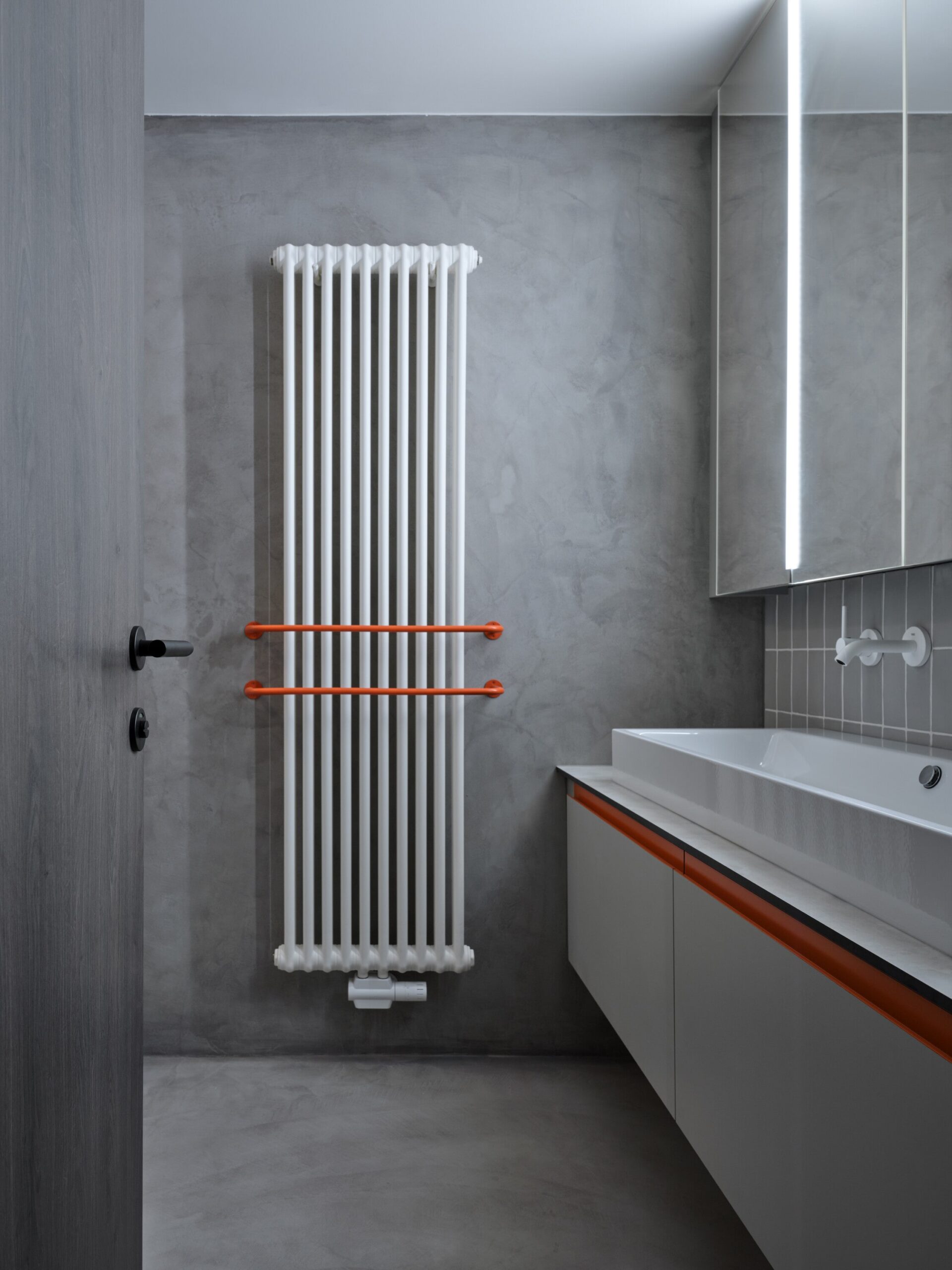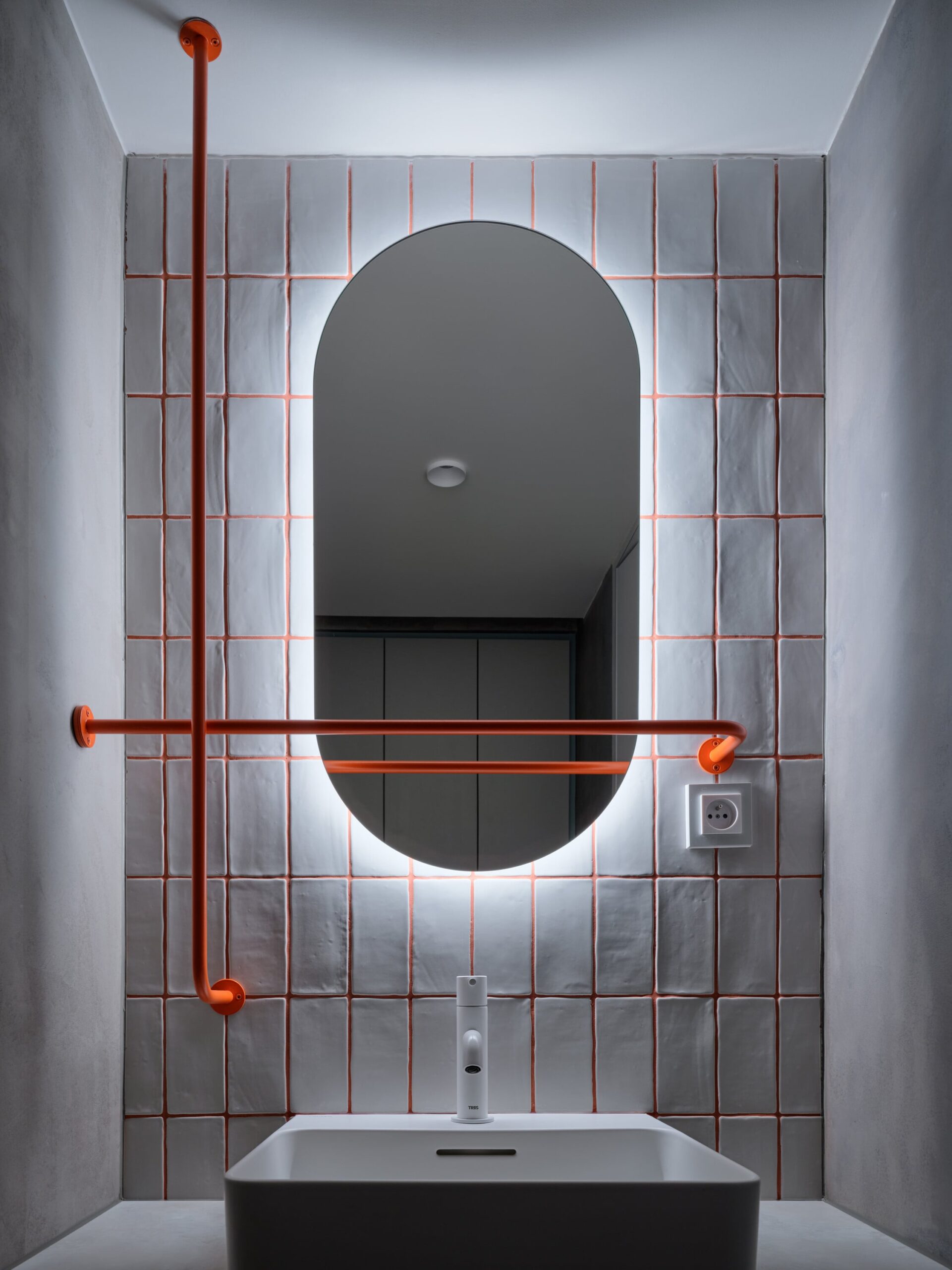 Gornji kat ostaje u mekim i kremastim nijansama sive. Osim drvene konstrukcije kamina, upečatljiv element je čelične stepenice s neobično dizajniranom ogradom od matiranih čeličnih profila, sa umetnutim perforiranim limom u odgovarajućoj shemi boja. Na dnu stepenica, gdje se nalazi prostor za pohranu, perforirani lim podupire ogledalo od nehrđajućeg čelika. Ova kombinacija stvara efekt ogledala prostora, zadržavajući praktičan pristup skladištenju. Na sličan način, dio konstrukcije hodnika djelomično je perforiran i djelomično opremljen ogledalom.